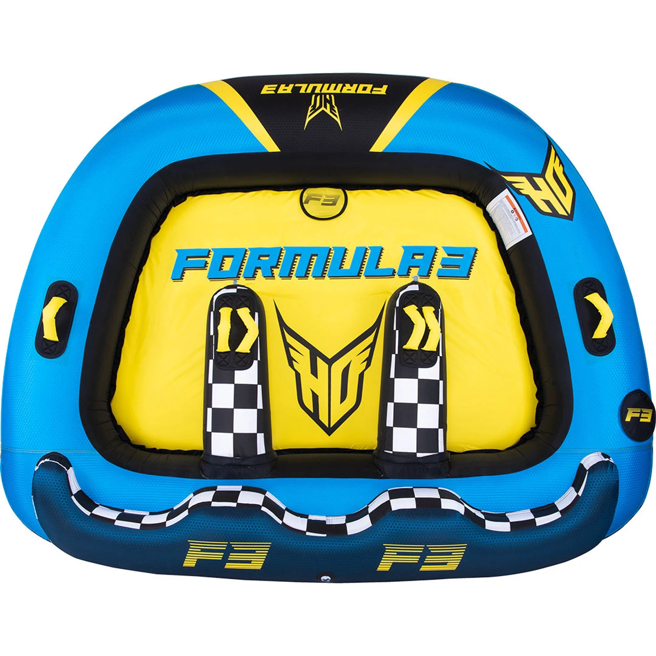 The Formula 3 is a fully covered tube that can accommodate 1, 2 or 3 riders! Put up to 3 people in the side by side, secure, cockpit style seats, sit back and enjoy the ride. The squared off back of the Formula 3 makes it stable in the whip while our new one piece floor makes inflation and deflation a snap. Made from the finest materials and backed by our industry leading 1 year warranty, the Formula 3 is sure to be the epicenter of your familyβs boating adventures.